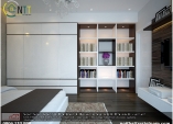 Phòng ngủ thứ nhất thiết kế tủ quần áo cùng giá sách tận dụng tối đa không gian một bức tường. Với một nửa bức tường là giá sách lớn bạn có thể trang trí cho không gian phòng ngủ của mìnhấn tượng và lôi cuốn hơn, nửa còn lại là tủ quần áo gỗ công nghiệp Acrylic cánh phẳng hiện đại.