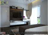 Thiết kế này giúp bạn có nhiều không gian lưu trữ đồ đạc mà vẫn đảm bảo sự gọn gàng. Phần tường phía đầu giường sử dụng giấy dán tường họa tiết nhẹ nhàng giúp tạo điểm nhấn cho căn phòng. Phía trước giường ngủ là kệ tivi sang trọng được thiết kế độc đáo và riêng biệt.