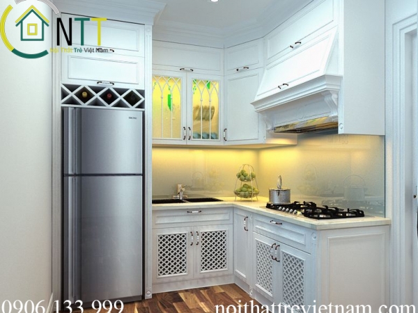 Nội thất sử dụng trong căn bếp này là tủ bếp 2 tầng chữ L, chất liệu gỗ sồi tự nhiên sơn trắng. Thiết kế tủ bếp trạm trần tăng tính thẩm mỹ đồng thời tận dụng không gian. Sử dụng kính màu trang trí tạo điểm nhấn.