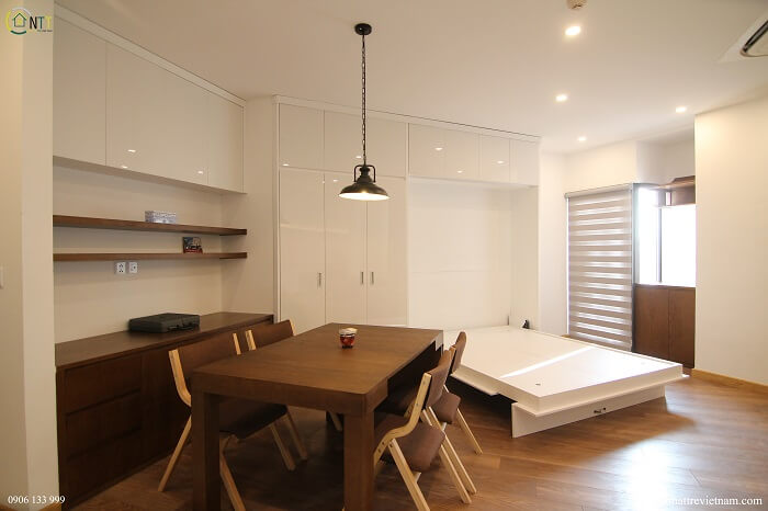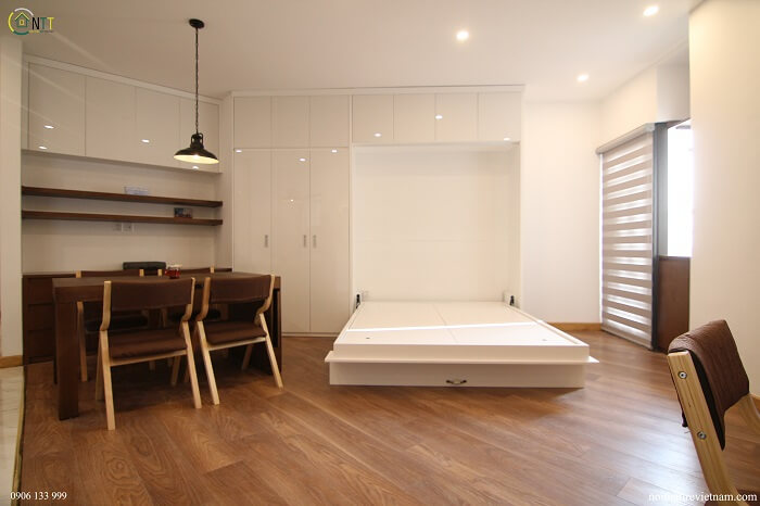 Thứ tự công năng từ phải sang trái là giường ngủ, sau đó đến tủ áo, bộ bàn ăn, phía trong bộ bàn ăn là tủ để đồ và đợt treo đồ