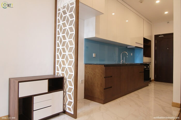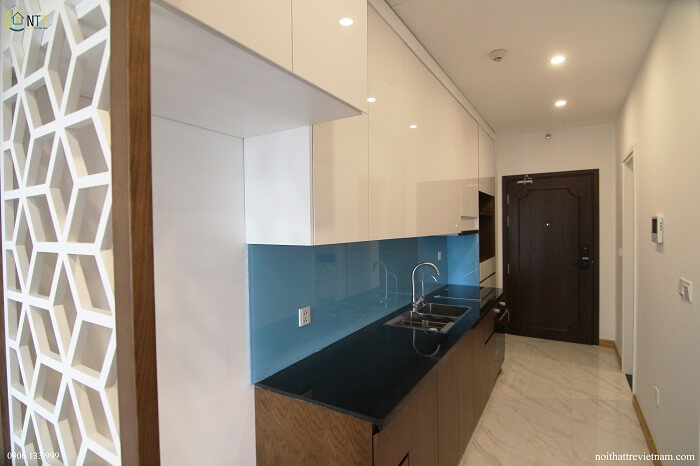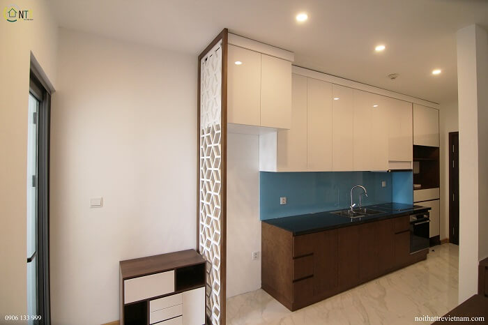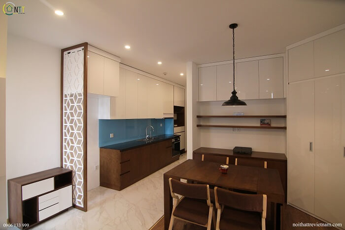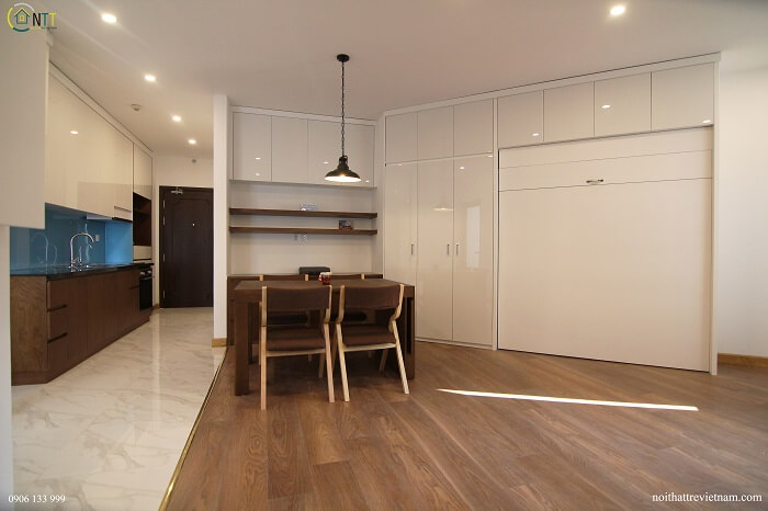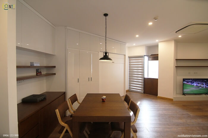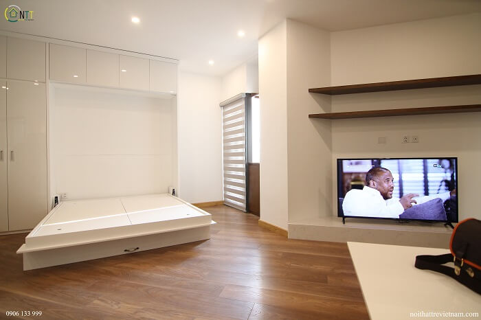 Nội thất sử dụng chủ yếu là gỗ Acrylic bóng gương màu trắng với lợi thế tạo cảm giác rộng rãi hơn cho căn phòng.