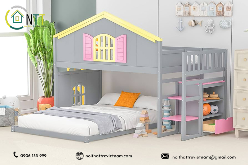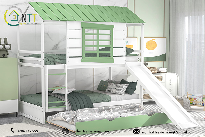 - Kích thích trí tưởng tượng: Thiết kế giường tầng cầu trượt có thể theo nhiều chủ đề khác nhau như lâu đài, ngôi nhà, v.v. giúp kích thích trí tưởng tượng và khả năng sáng tạo của bé.