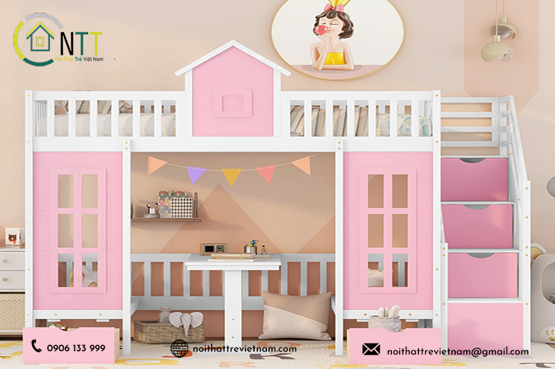 - Kiểu dáng: Giường tầng hình ngôi nhà màu hồng với mái vòm cong cong, tạo cảm giác như một lâu đài cổ tích. Mặt trước giường được trang trí với những ô cửa sổ nhỏ xinh xắn, tạo điểm nhấn cho căn phòng.