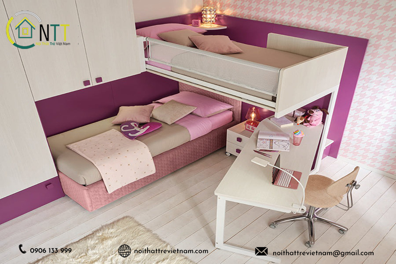 Ưu điểm thiết kế phòng cho 2 bé gái với giường tầng cầu trượt: