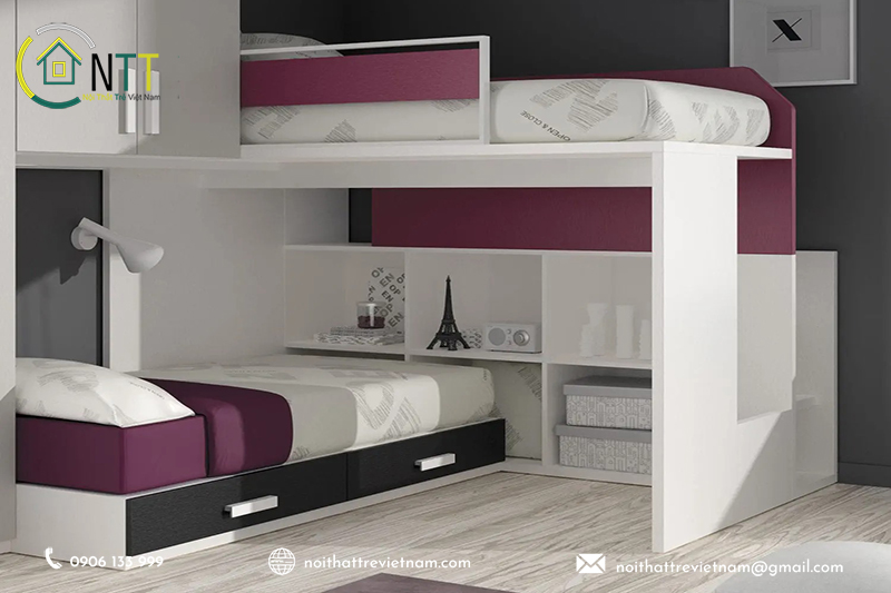 - Gắn kết của 2 bé: Giường tầng giúp bé có không gian riêng tư nhưng vẫn gần gũi với nhau, tạo điều kiện cho bé giao lưu, chia sẻ và tăng tính gắn kết giữa hai bé.