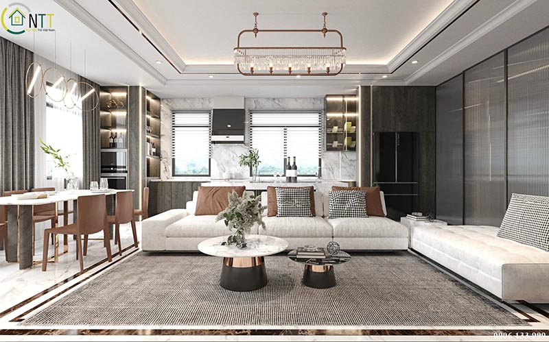 Phòng khách của căn hộ chung cư 3 phòng ngủ thường có diện tích lớn nên gia chủ thường ưu tiên thiết kế phòng bếp và phòng khách liền nhau. Sự kết hợp này tạo sự ấm cúng khi các thành viên cùng quây quần. Cách thiết kế này mang đến một diện mạo liền mạch cho toàn bộ không gian giúp tận dụng ánh sáng tự nhiên hiệu quả hơn.