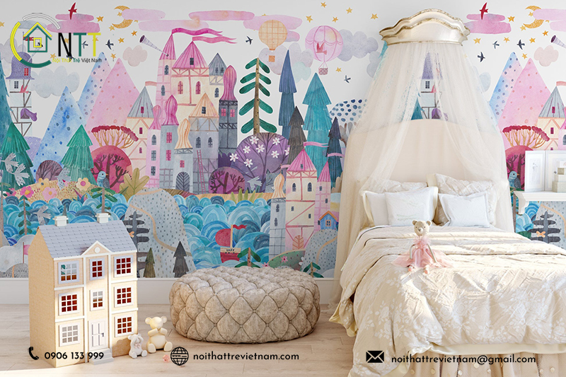 - Sử dụng giấy dán tường có họa tiết cổ tích phù hợp với chủ đề đã chọn.