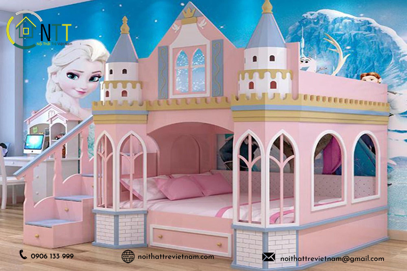 - Kiểu dáng: Theo phong cách cổ tích, ví dụ như giường ngủ hình lâu đài, giường ngủ hình xe ngựa, hoặc giường ngủ hình vỏ sò.
