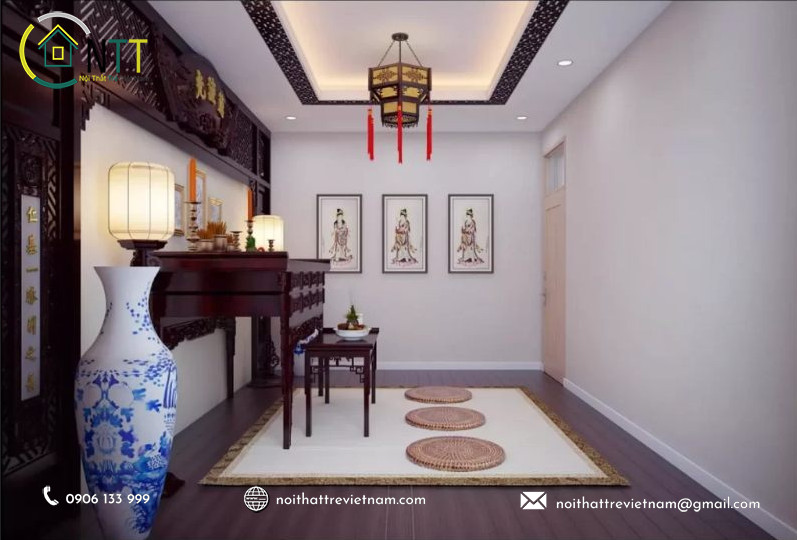 - Mẫu thiết kế phòng thờ cách Á Đông:Thiết kế cách Á Đông thường sử dụng những gam màu trầm ấm như nâu, đỏ,... kết hợp với các chi tiết trang trí mang đậm dấu ấn văn hóa phương Đông. Mẫu thiết kế này phù hợp với những gia đình yêu thích văn hóa truyền thống