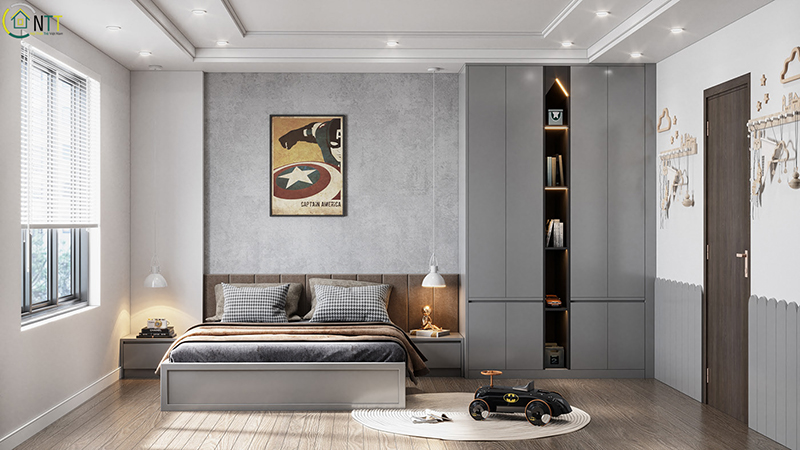 Tủ tường dành cho không gian phòng ngủ được xem là một đồ nội thất trang trí hữu ích, đây là nơi để trưng bày những đồ vật khác nhau, những món đồ lưu niệm hoặc các món đồ chơi mà bé nhà bạn thích.