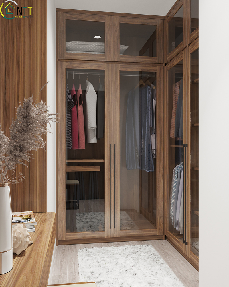 Tủ quần áo gỗ óc chó trong phòng ngủ sang trọng